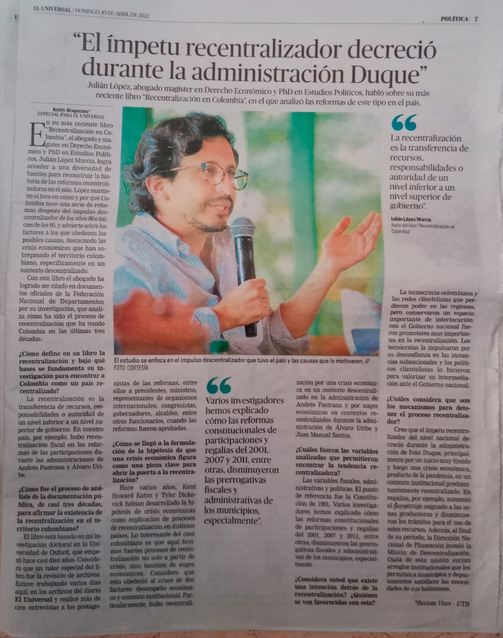 El Universal, “El ímpetu recentralizador decreció durante la administración Duque”